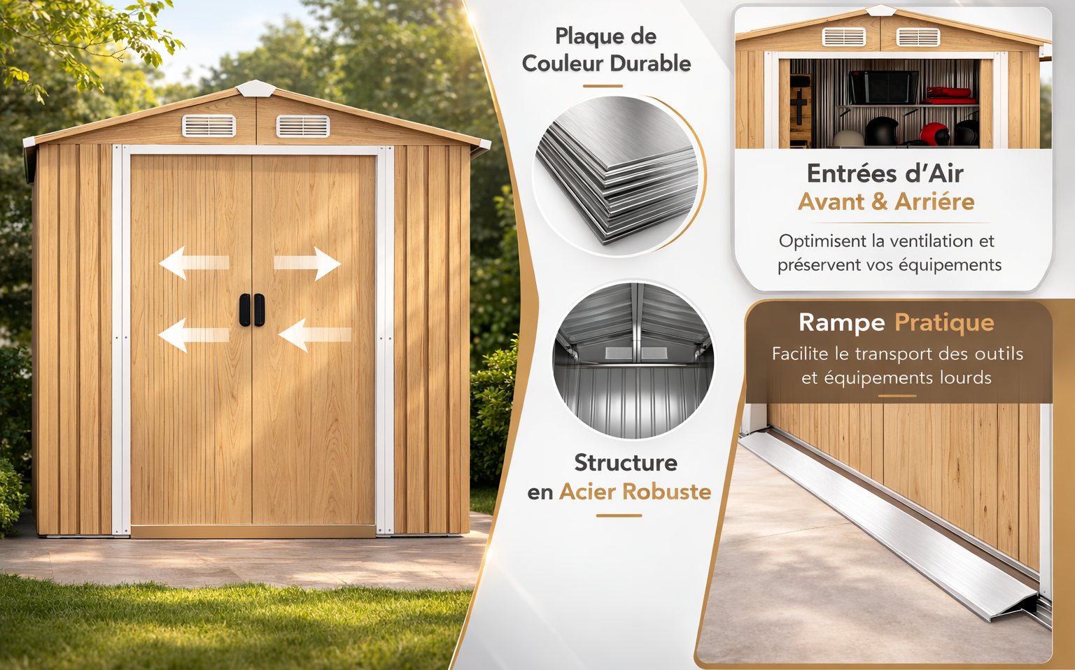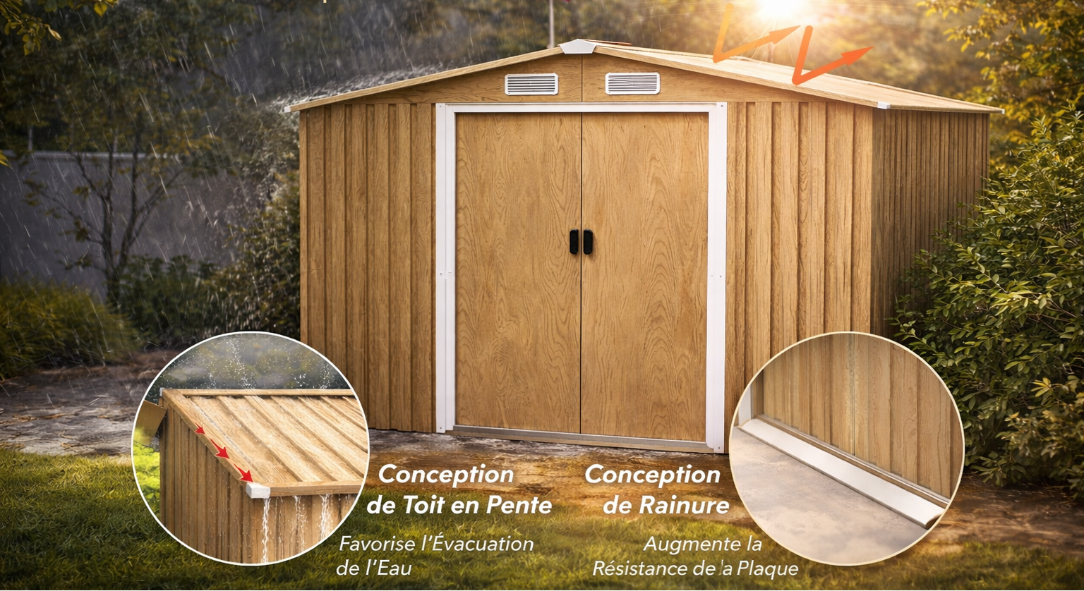 La structure est conçue en acier galvanisé avec un revêtement aspect bois, pour associer une apparence plus chaleureuse à un usage extérieur. Le toit en pente favorise l’écoulement de l’eau, et les 4 volets d’aération participent à la circulation de l’air afin de conserver un environnement intérieur plus sec pour les objets rangés.